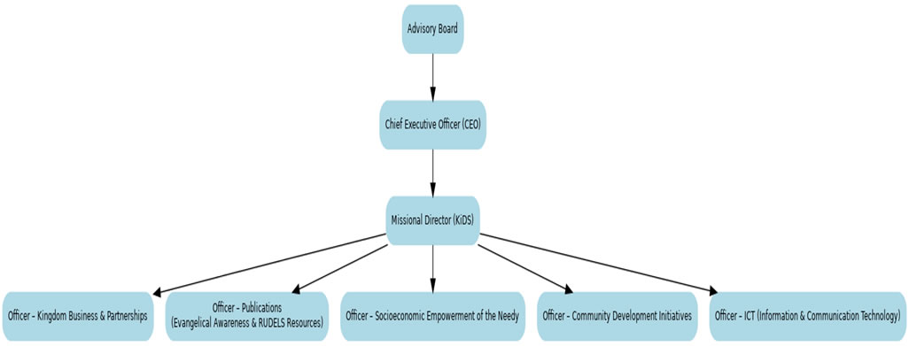 The operational and missional hub of RUDELS is Kingdom at the Doorsteps (KiDS), which serves as the platform anchoring spiritual, socioeconomic, and developmental initiatives. The Missional Director leads KiDS, supported by a team of specialized officers. These include officers responsible for Kingdom Business and Partnerships, Publications, Socioeconomic Empowerment of the Needy, Community Development Initiatives, and ICT (Information and Communication Technology).